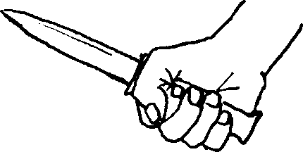 握法右手持匕首四指卷曲紧握刀柄拇指扣压食指第二关图193图193节护手抵住虎口刀尖向前手心向内。(图193)图193图193(—)直刺右手反握匕首由右侧腰间向前猛刺对方腹部。(二)右斜割刀尖向上,刀刃向左斜下方右臂由右斜上方向左斜下方划弧割对方左侧面部、颈部、肩部。)左斜割刀尖向左肩上方刀刃向右斜下方右臂由左斜上方向右斜下方反臂划弧割对方右侧面部、颈部、肩部。
