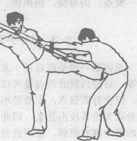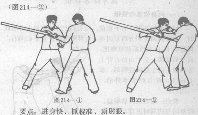 我左脚向前上步进身稽向下曲膝含胸右臂曲肘用右臂外侧肉厚部阻挡敌棍中部右手从敌棍上向下扣抓敌棍猛向后拉(图214—1)左臂曲肘内旋略于肩平右肘尖向前猛顶敌心口正中。我左脚向前上步进身稽向下曲膝含胸右臂曲肘用右臂外侧肉厚部阻挡敌棍中部右手从敌棍上向下扣抓敌棍猛向后拉(图214—1)左臂曲肘内旋略于肩平右肘尖向前猛顶敌心口正中。图215图215