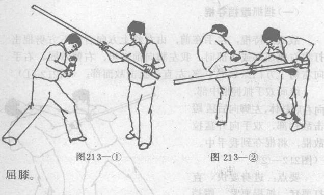 我左脚向前上步进身稽向下曲膝含胸右臂曲肘用右臂外侧肉厚部阻挡敌棍中部右手从敌棍上向下扣抓敌棍猛向后拉(图214—1)