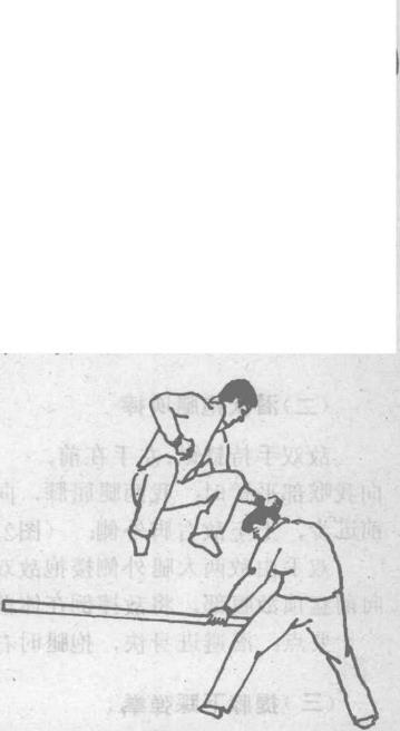 敌双手持棍左手在前由左向右扫打我下盘踝关节或小腿时我双脚蹬地向前、向上跳起使敌棍走空。双脚在敌左侧体前落步左臂向左直臂扫出以左拳