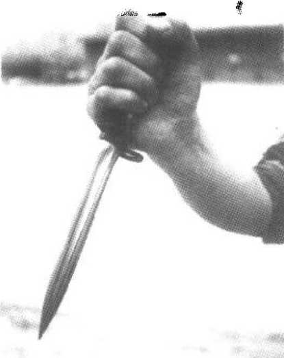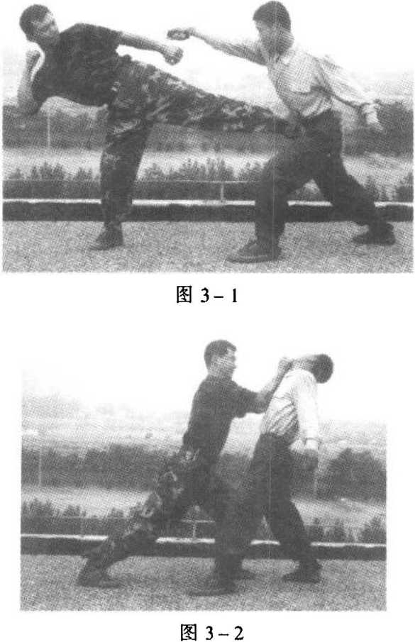 图A军事行动和日常生活中,匕首对人民生命财产安全构 成严重威胁。徒手夺匕技法很多,本书介绍的是常用的技 法,是在军拳实用技法基础上,按踢、打、摔、拿的顺序编撰 而成。动作要求:快、准、狠。常用握匕的手法有正握匕和反握匕两种。如,图A、图 B所示。第?节踢1 ?侧踹击头:敌右手反握匕首,上左步向我头部胸部刺 来。我重心后移,同时起左脚猛踹敌腹裆部(图3-1);接 上动,我重心前移,右拳上勾敌下须(图3-2)0实用要领:侧踹要突然、准确、有力°敌快速上步,我以 此技法可阻敌近前。图3-3