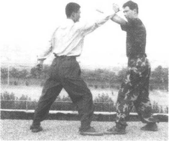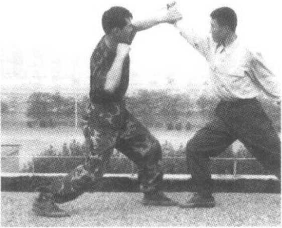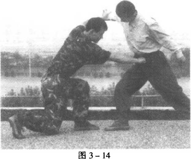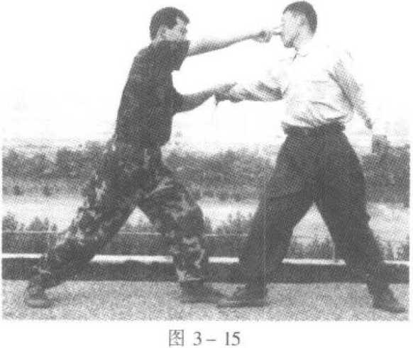 :敌右手正握匕首,向前上右步,由上向下 刺我头部(胸部)。我左脚前上步,左手由里向外挡抓其右 手腕翻拧(图3-13),右拳下击敌腹(裆)部,可致敌休克,图 3- 13实用要领:抓腕快准,击腹猛狠。挡抓后也可击敌头 部、裆部、肋部等人体薄弱环节,如(图3-15):挡抓插眼。图 3- 16