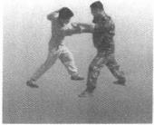 基本技法敌左脚在前持刀向我头部刺来时左脚迅速向左前方上步闪身右手向上托住敌右肘(图4-104),左手虎口向下反抓敌右手腕(图-105),左手用力向左侧扳敌持刀手腕反拧敌肘关节(图4-106),将刀尖对准敌头部猛推敌手腕刺敌头部(图4-107)。