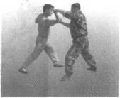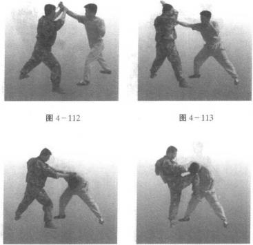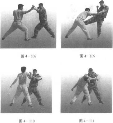 基本技法当敌刀向我左胸刺来时左脚向右前方上步闪身的同时左手挡抓敌持刀手腕(图4-108),左手向下拧敌手腕的同时右脚猛踢敌裆部(图4-109),右脚落地右臂向上猛击敌肘关节(图4-110),乘敌身体后仰之际右手反抓敌头将敌制服(图4-111)。