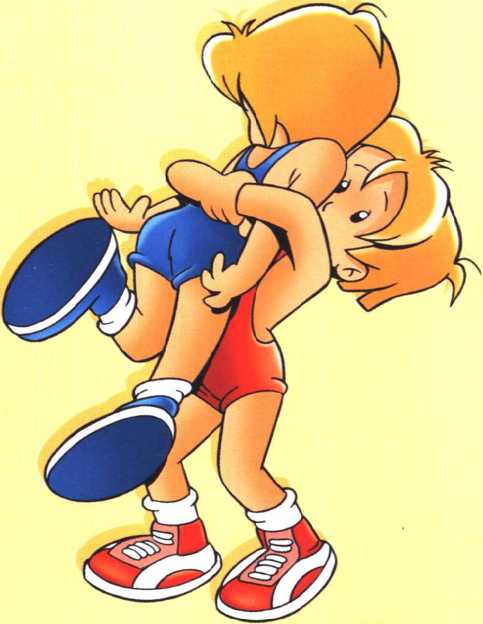 摔跤选手穿的是连身的弹性 运动衫,肩部有衬垫。比赛双方服 装的颜色分别为蓝色和红色。