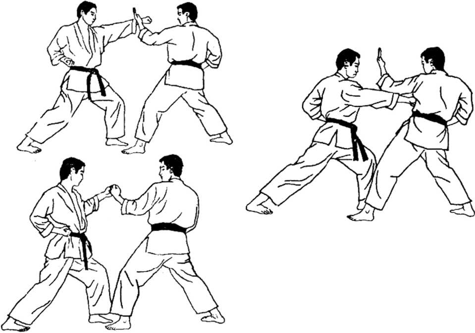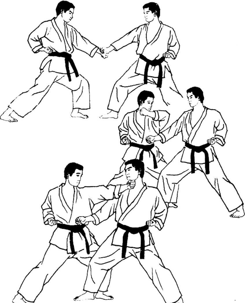 后拳打与前相同,根据与对手的距离以左腿或右腿前踢对方中段或下段,以右腿踢时要 防对方抱腿,前踢用力部位应是前脚掌。图(46)
