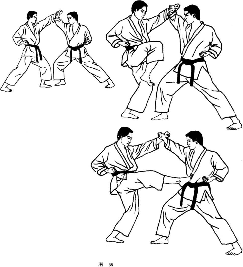 此为顺击与前踢两个大技巧的组合,注意上体保持正直,不要向前倾,直击后迅速前踢 中段使对方防不胜防、着力部位可用前脚掌,亦可以脚背踢裆部。图(38)