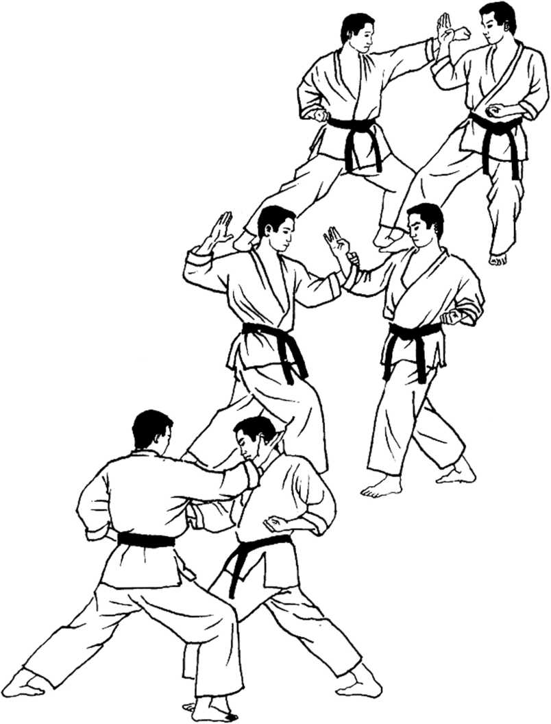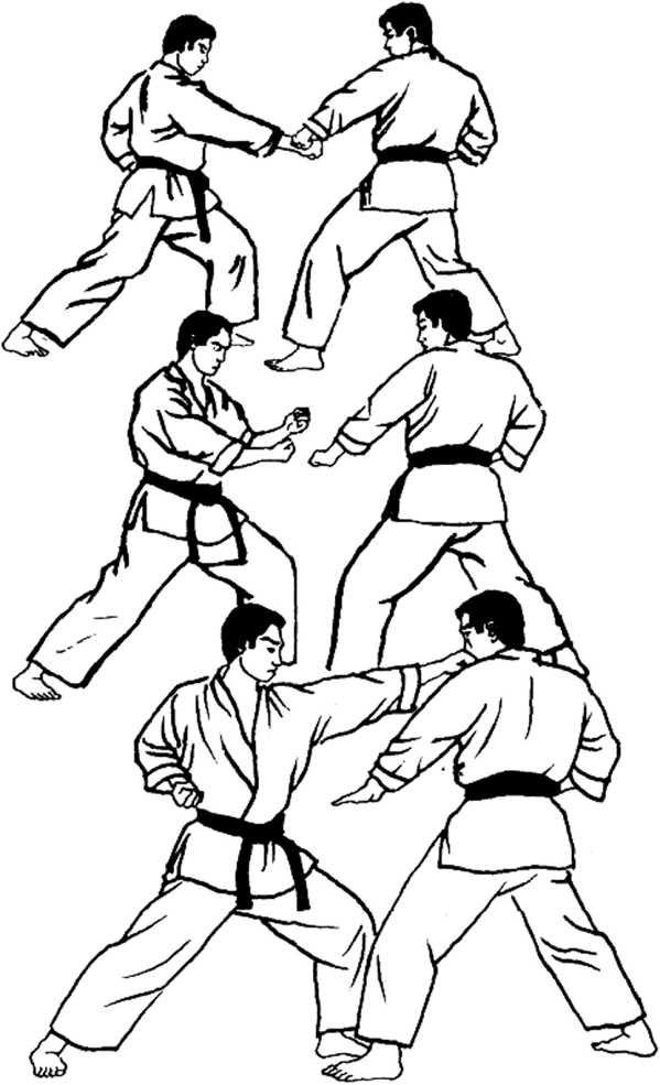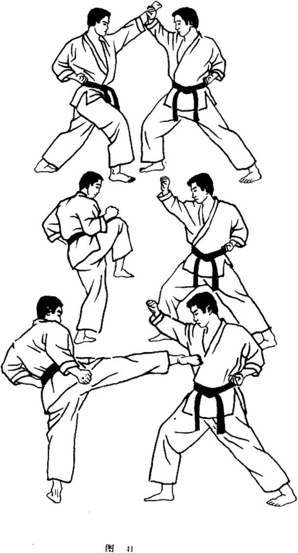 这是快速的连续出击,用逆击引诱对方中段,趁空隙刺击对手。图(40)逆击f横踢进这是以上段逆击的攻击使对方中段防守造成空隙,然后利用前脚横踢加以攻击的技巧 注意:膝的抬起要迅速,着力部分全脚掌。图(41)刺击(手刀接)一手刀打此招要领.刺击属卜试探性进攻,引诱对方把防守放到左侧,同时右腿急速向前跨进接 若以手刀打全力劈砍,注意:要充分利用腰部的力量、、图(42)图 12
