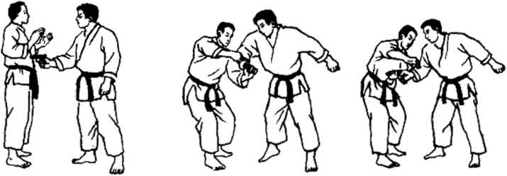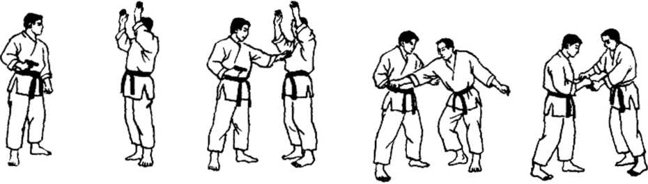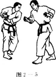动作过程:两人正面相遇,相距约两公尺,对方左脚向前半步,并将手枪握在腰间指向 我腹部:责令我将双手举起(图2 — 1)。对方向我靠近用其左手向我身体搜查(图2 — 2)。 上体稍右转,上体前倾,用右手抓紧其枪筒,并向外推挡(图2—3),左手从下抓握枪身 (图2 —4)。双手用力向外拧转反其腕关节将手枪夺下(图2 — 5)。用枪底击对方头部 (图 2 — 6 ) 0