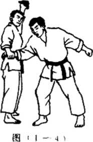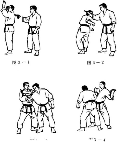 动作过程:两人正面相遇,对方右脚向前半步,并将手枪顶住我腹部。此时,应将双手 慢慢举起(图1一 1)。迅速转身,左手拇指向上抓握枪口下面,并向右推挡(图1 一 2)。 右手抓握对方肘窝向前下方牵引,使其身体重心前倾;左手向下拧转,迫使对方放下武器 (图1 一3)。左手夺枪;右手抓握对方右手腕,并准备用枪身击对方头部(图1—4 )。