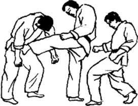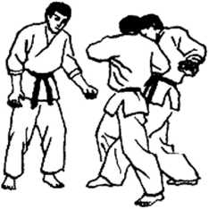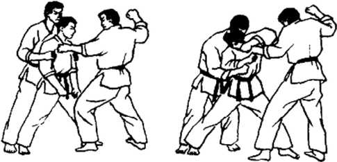 一个对手从身后抱我两臂,同时,另一个对手抓我胸襟,举右手准备攻击我面部。
