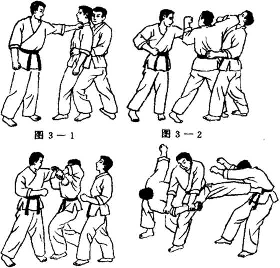 ④左手扭拉前方对手的左手,同时我右手下压其肘关节,起左脚攻击准备偷袭我的后方 对手。(图3、1 — 4 )