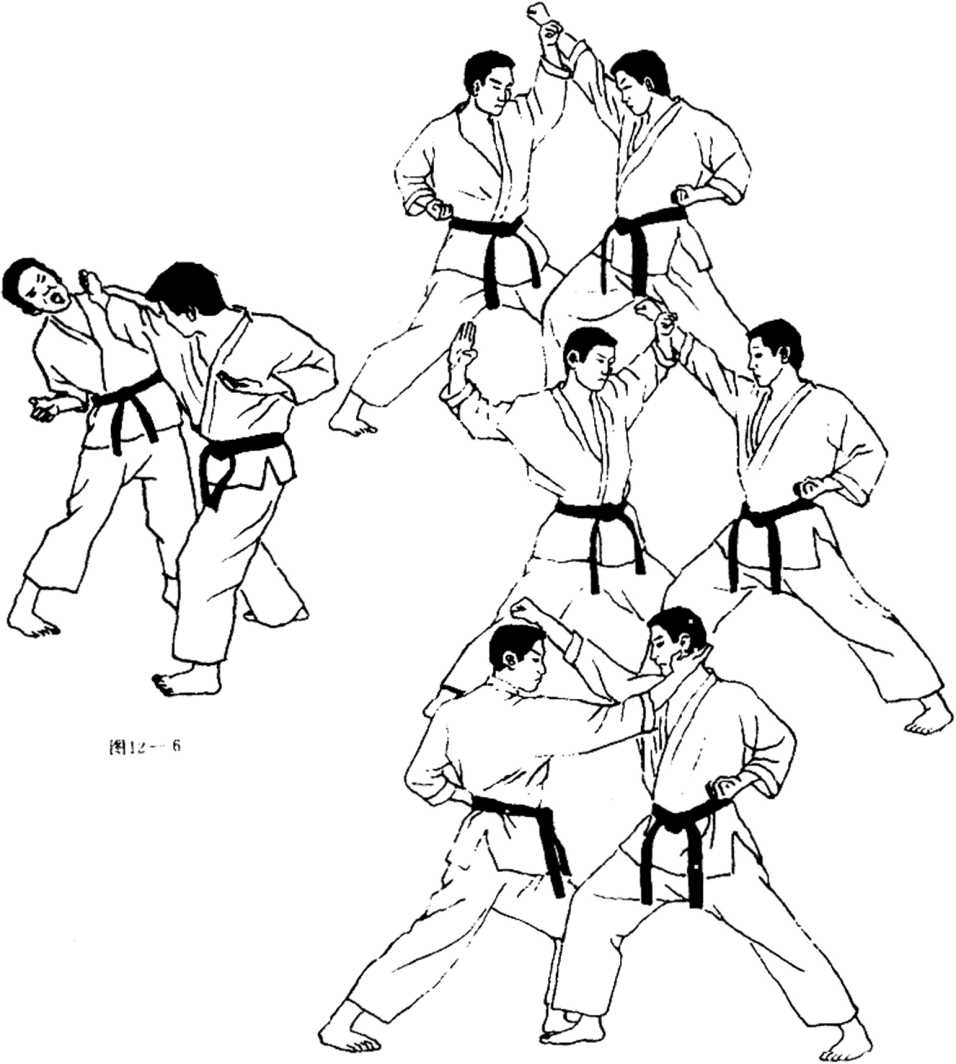 ③手刀侧腹打:此技法主要用于化解对F对我上段的攻击后,防守反击及主动进攻时运 用,击打时.可将手举至耳后,从上向斜下方劈砍对手、肋、腹、肝、脾脏等部位,图12—6