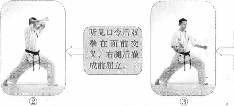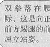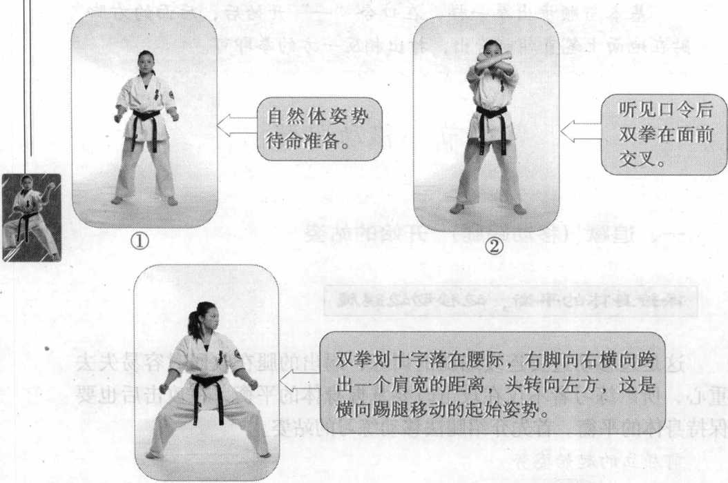 这是边移动边要连续踢腿的训练,踢出的腿在收回时容易失去 重心,所以练习者不仅在攻击时要掌握身体的平衡,在攻击后也要 保持身体的平衡。首先介绍腿法移动练习的站姿。前屈立的起始姿势①①①①四股立(骑马立)的起始姿势四股立(骑马立)的起始姿势③③四股立(骑马立)的起始姿势四股立(骑马立)的起始姿势③③