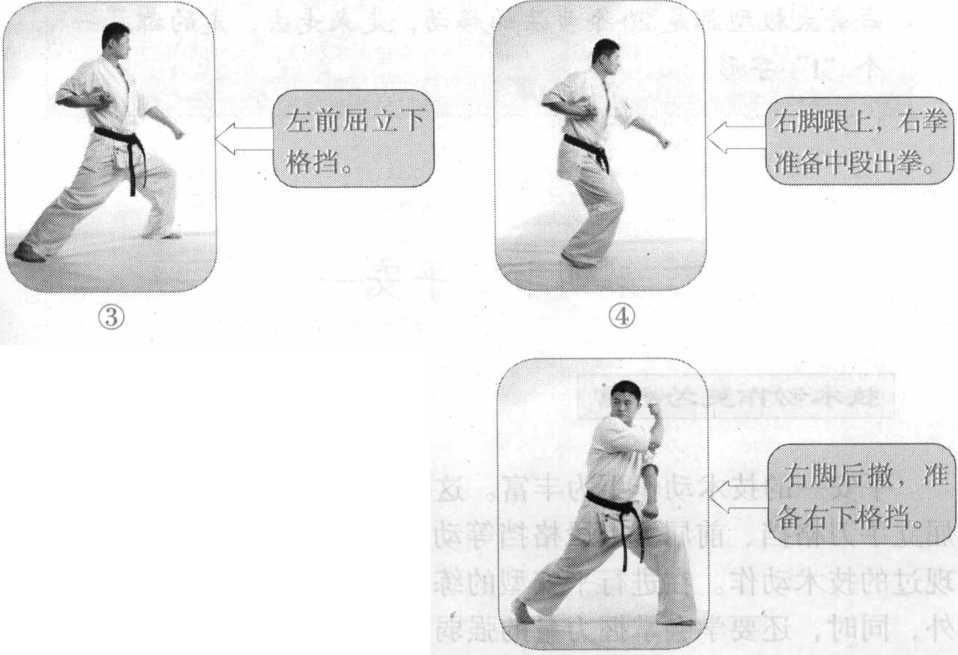 技术动作更为丰富技术动作更为丰富平安一的技术动作更为丰富。这套型中出现的后屈立铁槌、后 屈立手刀格挡、前屈立上段格挡等动作是在“太极”类型中所未出 现过的技术动作。在进行平安型的练习时,除了注意动作准确性以 外,同时,还要学会掌握力量的强弱、动作的缓急、身体的伸缩以 及呼吸的调整等。学习目的如果只停留在动作上是看不透空手道本 质的。平安型从一到五共有五套,在这里我们介绍平安一。重心I收右脚, 后移到左 后屈立, 上抬,右 到脑后。I收左拳,右拳从 脑后划弧线铁槌 击打。出手时注口脚跟落下,]