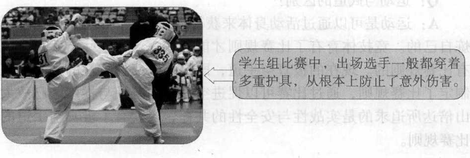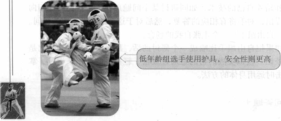 (由于少年儿童正处于身体发育 阶段,在少儿、青少年组比赛的时候从安全方面考虑,可以适当地 使用护具)。所谓“直接击打制”是指拳脚全力击打对手身体,给 予打击伤痛。“无体重差别”指的是选手没有挑选对手的余地,轻 量级的选手往往会与重量级的选手在比赛场上相遇。空手道一旦竞 技化之后,一定要设定比赛规则。现行的比赛规则是以“赤手空 拳、直接击打制、无体重差别”这三根支柱作为基础的。