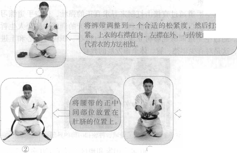 穿着道服也是训练的一个内容,首先要掌握穿道服和系道带的正 确方法。因为出汗等原因,道服上散发出来的异味会影响到其他人的 训练,所以训练后一定要养成清洗道服的习惯,以保持道服的整洁。