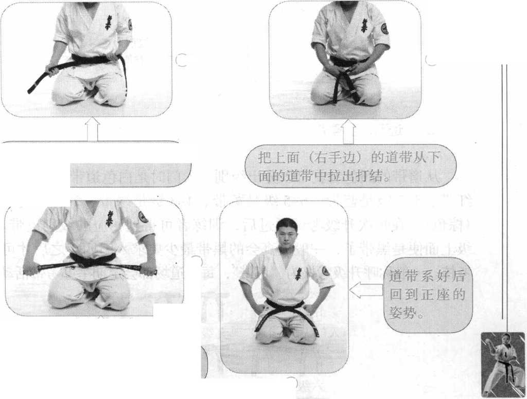 ⑤⑤⑥⑥??为了避免在训练时道带松开,应 耨道带的两端用力向外拉至最紧。为了避免在训练时道带松开,应 耨道带的两端用力向外拉至最紧。两端道带上下交叠,右手边、 、的在匕两端道带上下交叠,右手边、 、的在匕二、道服的叠法