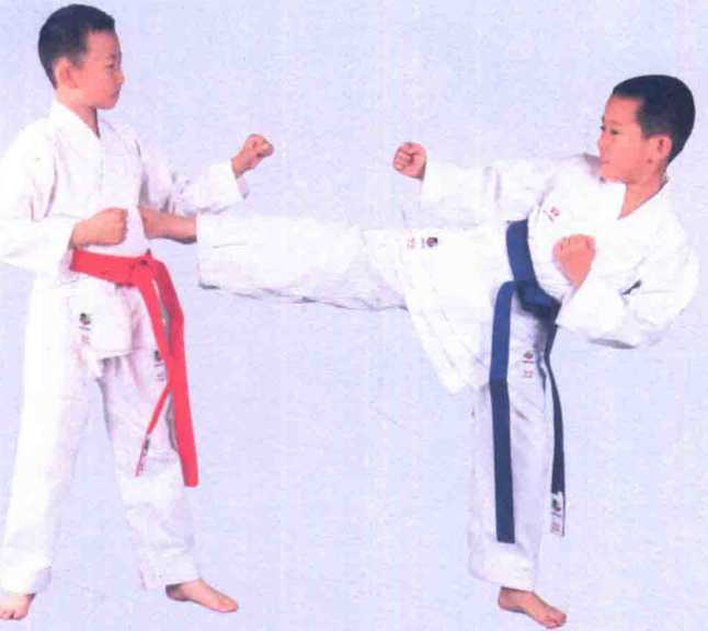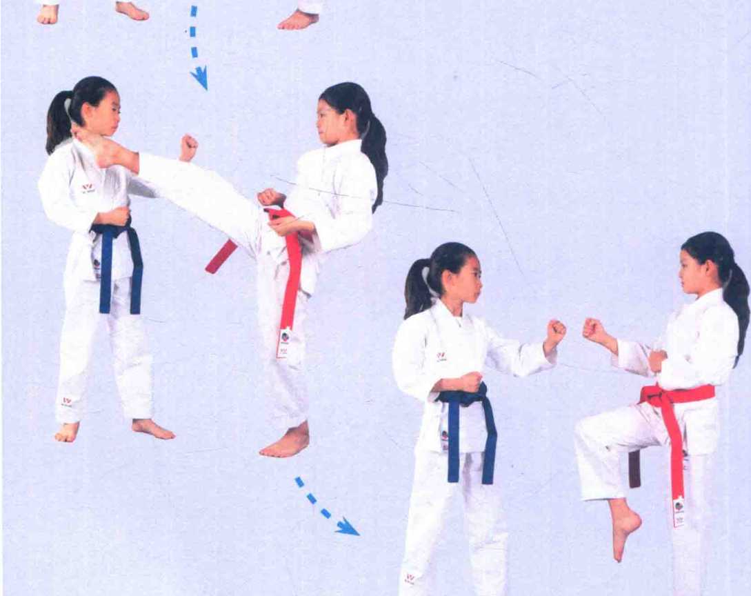 身体重心移至前脚膝部微屈在前脚用力蹬地的瞬间后腿向中线快速提膝提至最高位时膝关节带动脚面外侧踢击对手上段。击打后迅速回收小腿落地。恢复预备站架。