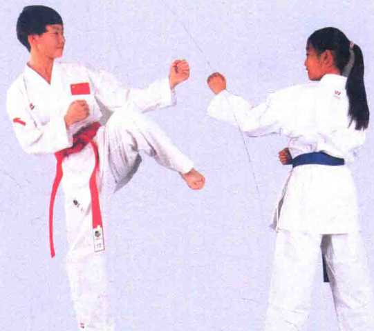 进攻腿膝关节迅速提膝到心窝前蓄劲快速有力地踢击对方中段虢关节、脚跟和击打目标成一直线。以前支撑脚为轴带转后腿踢击后迅速收膝落地使重心平衡身体直立。恢复预备站架。