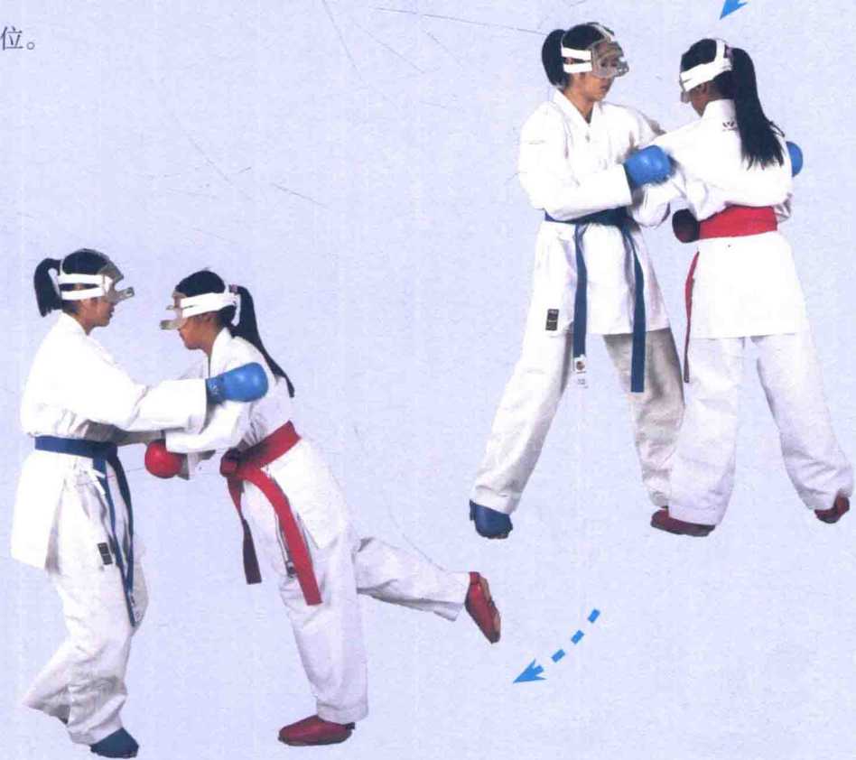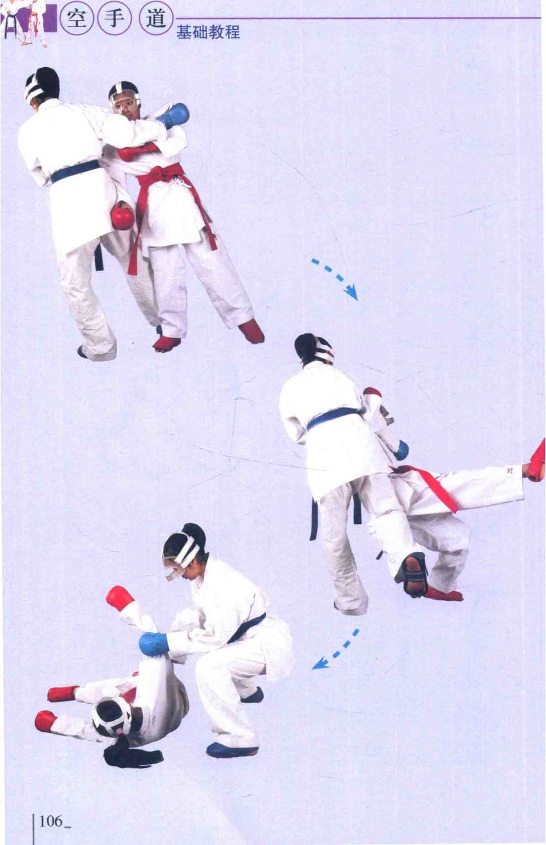 技术要短利用后手上段击(对手躲防时)迅速贴靠双手抓住对方两肩部道服的同时前腿后撤迫使对方失去重心并交换支撑腿右腿绊对方支撑脚,使对手失去重心倒地迅速四股立出拳击打倒地对手的有效部