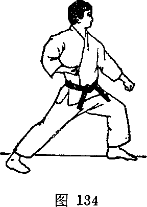 巨右脚靠向左脚旁,这时保持左膝的角度,右膝也弯曲* 上体不动(图135)0