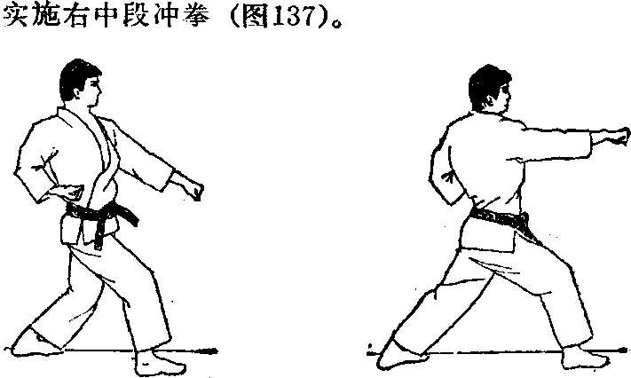 ④ 图136图136图137图137右中段顺位冲拳:右脚继续前迈半步,成为右前屈 步,