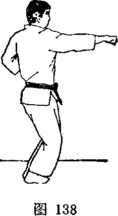 ③ 左拳向前伸出,同时右脚前移半步。这时右拳仍然收 抱在腰侧(图136)o