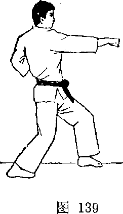 ⑥ 右拳再往前伸,同时左脚前迈半步。这时左拳仍然收 抱于腰侧(图139)。