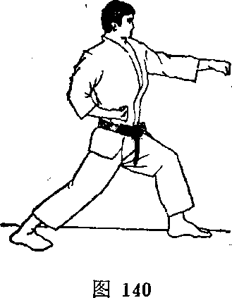 ⑦左中段顺位冲拳:左脚继续前迈半步,戊为左前屈 步,实施左中段顺位冲拳(图140)o