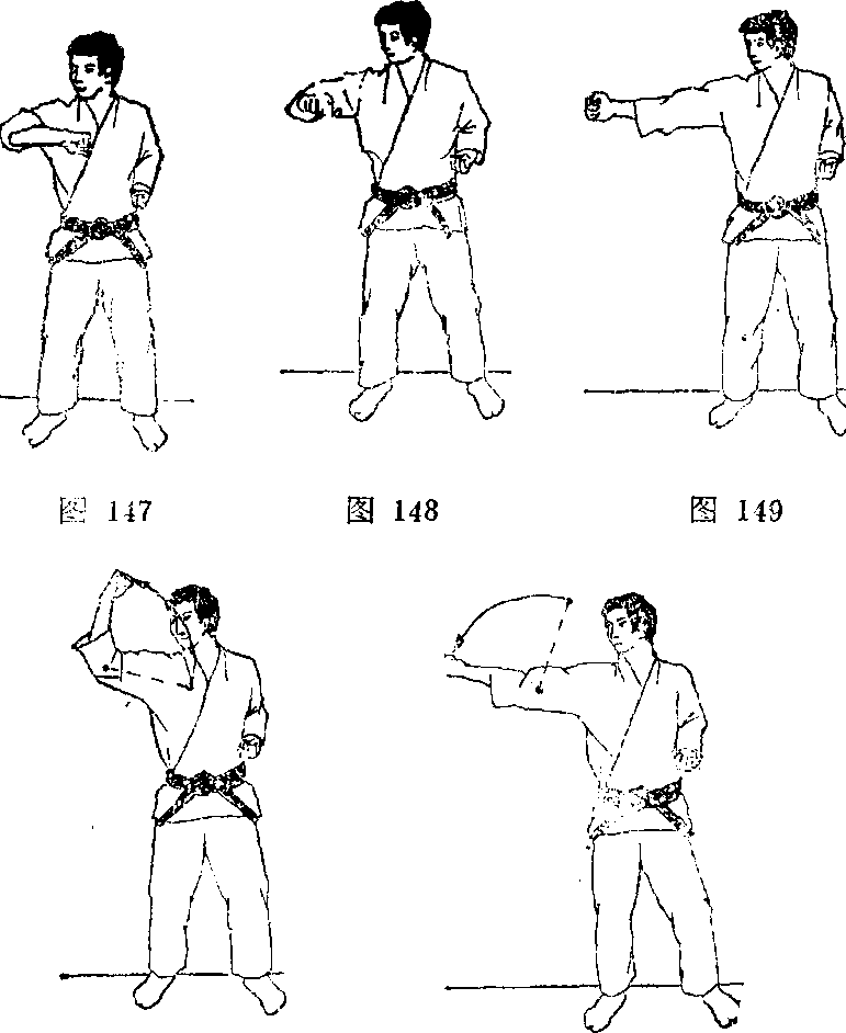 ② 以肘为中心,拳背向上,与地面平行划弧摆打 (图 148)。