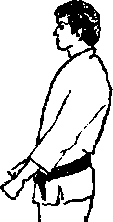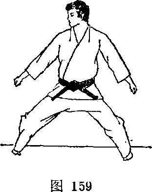 从自然体外八字步向骑马步转换的练习。通过练习,不 但要懂得步法变化,还要体会肌肉的收缩方法。骑马步的练习① 预备式:自然体外八字步(图158)。两臂在胸前大交叉,同时右脚向左前移动。② 骑马步:两臂张开,同时向侧舂开步站立,脸继续朝 前,并确认步法是否正确,收缩肌肉约10秒钟(图159)。返回预备式,多练习几次。
