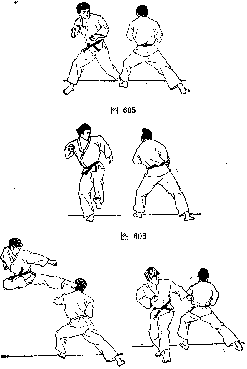 ① 对方用中段顺冲拳攻来时,身体重心旁移至右脚躲闪 (图 605)。② 躲闪后,右脚踏地起跳,同时屈抬左脚(图606)。③ 高高跳起,左脚朝斜下方踢击对方侧头部(图607〉。④ 右脚、左脚依次向对方斜后方落地(图608)。注意点:① 错体(躲闪)要在对方冲拳即将到位之前进彳九② 要掌握好跳跃的时机。—、复习本周第一天所学的内容第二天第二天二、 自由组手第二天第二天