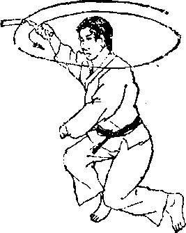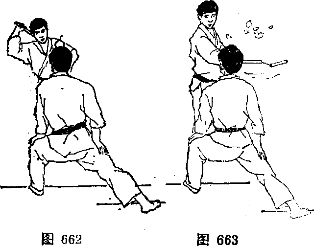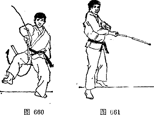 是改变动作运动方向时使用的技法。例如从大上段姿势 舞开的棍,用小股翻改变了动作方向(图660)o图661是用 小股翻把抛在空中的苹果击碎的瞬间.图662、663是从大上段姿势舞起,将放在头顶上的苹果 击碎的瞬间。躲开对方攻击的同时,腾身而起,用挥棍圈打技法转入 反击状态(图664)0图664