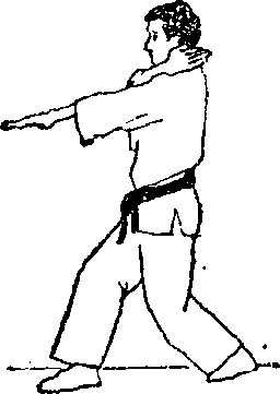 ② 保持膝部角度,右脚移向左脚旁,同时右手刀置于左 肩,左手前伸(图259)。