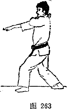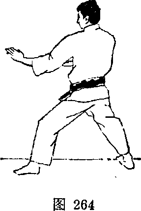 ① (从图261,左后屈步开始)保持左膝的角度,右脚 收回左脚旁,同时左手刀置于右肩,右手前伸(图262)。 "'②腰向正面不变,右脚后撤半步(图263)。