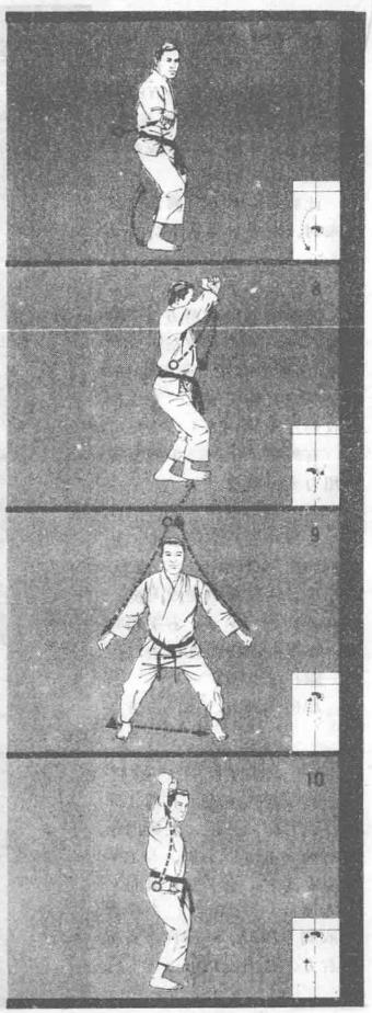 左脚向预备势的后方迈一 步,两腿弯曲成马步。同时, 两拳由十字上架分别向左右两 侧外开,拳与跨同高.拳眼朝 前(图9 )(这是从预备势的 左侧看到的画面)。