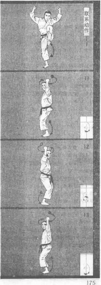 9. 马步“山”字上格击 马步不变,两脚同时向预 备势的后方滑动。两拳由体侧 备势的后方滑动。两拳由体侧 向前上方左右两侧双分拳,拳 心相对,拳高过头,肘关节弯 曲与头构成“山”字形(图10)。