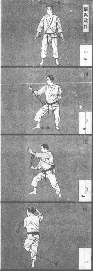 左脚不动;右脚经右脚前 向左(预备势的后方)上步使 两腿成交叉,脸转向左方。同 时,两拳交叉向头上方架