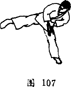 1,右腿屈膝向上提起,上体倾 斜,身体重心平稳.向侧踹腿〔图 107 ]。