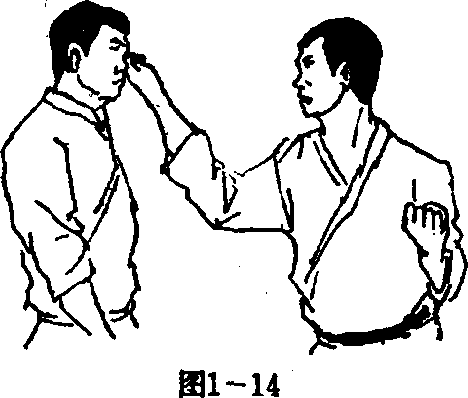 要领,击打目标时,要利用腰部旋转与腕部弹力。当对 方从右或从左抓来时,借对方的扭力,击向对方面部及锁骨 处,着力点应在拳面部分,击完应主刻收回。(图1-14)