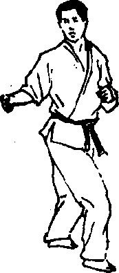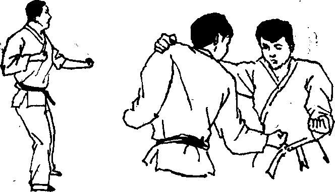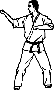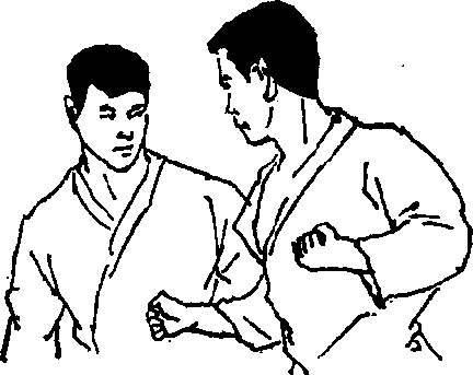以半身姿势为主,向直接攻来的对手的胁腹部或位于侧 方的对手之腹部击打。此时要利用腰部的旋转,不仅可晃过 对手的攻势,而且还可助拳以力量。(图1-16)
