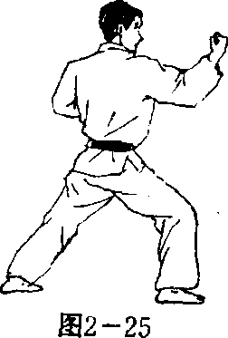 招势与中盘进击动作相” 似。左手向下盘挥击右足 前上一步,同时;右手向右外 方招架,双足保持在一直线上. 进行。(图2~25)转身时, 左足一边后收?身体一边旋转-