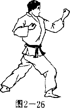 左拳击向下盘,成左前弓 步,右足前上一步,顺势出右 手成右上盘招架姿势(图2 一 27)同样,左足踏出一步, 顺势变为左上盘招架姿势。