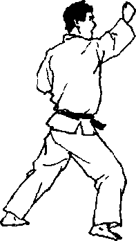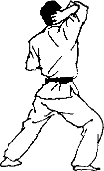 左手向左下盘挥击,左手 回收时,右手立即变为右外侧 的反招架姿势,接着右足前踏 一步,则成左外招架姿势。