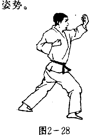 左手挥向左下盘,成左前 弓步。当左手回收时,顺势成 为右上盘反招架势3右足踏出 一步,顺势成左上盘招架姿 势。(图2-28)同样,左足踏 出时,顺势成右上盘招架姿势。