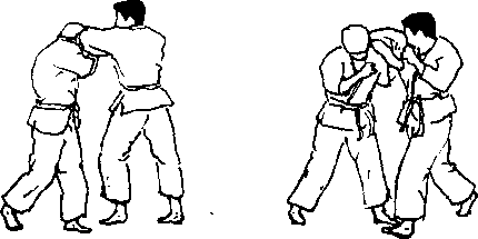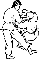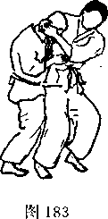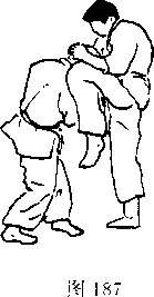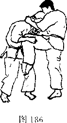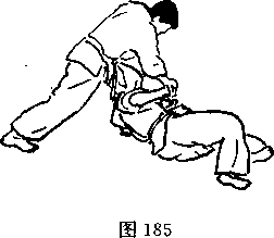 2. 我方两手抓住对方的脖子,左膝上顶击其心窝处 (图186);若对方后缩,则左腿下落后再次上顶其头部 (图187);上动不停,左腿下落,两手抓住对方的两肩,以 右足底为力点拦住对方的右脚外侧,身体右转,将对方往 右下方摔(图188)。