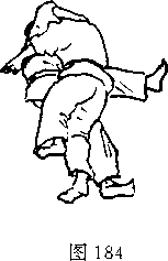 图181图1821.我方左脚上步,左肘向右横撞(图181);向左转 身,右肘横击(图182),?若对方躲开肘撞,则两手拉住对 方的脖子,身体左移,右脚上步,以臀部右侧顶住对方的 小腹(图183);随即向左下方转体,两手带对方脖子向左 下,右腿向后上挑起(图184)。此动作亦可用两腿膝关节 一齐猛然蹬直,以臀部顶紧对方的小腹摔倒对方,对方倒 地后再补上一拳(图185)。