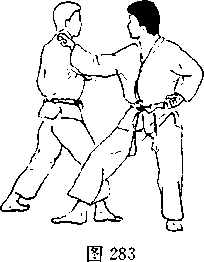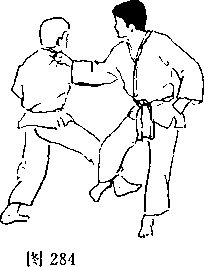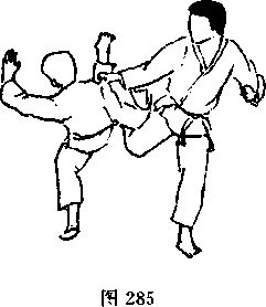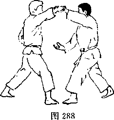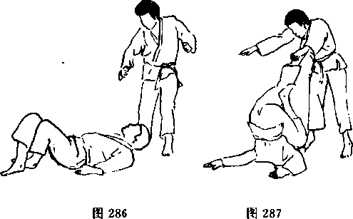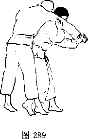 我厅突然用右脚踢击对方面部(图 282)。3.对方用右手抓住我方右肩(图283),并EL用右脚 跟反勾我方右腿(图284)。对方下拉我方右肩,并向左转 体(图285)。我方被摔倒在地,在对方准备再击打我方时(图 286),我方突然用右脚踢对方心窝(图287)。图290图2914?对方用左手抓住我方右臂(图288),上右脚并向 左转体,用右手上举我方上臂(图289)。对方俯身将我方 背摔摔倒(图290)。我方被摔在地,准备反击(图291)。时 机合适时,突然用右脚反踢对方脸部(图292)。图290图291阌292