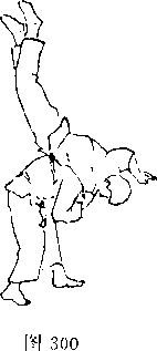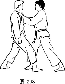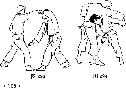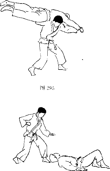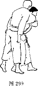 对方用左手抓住我方右臂(图293),并用右臂插 入我方裆部上抬,同时向前迈右脚(图294)。对方一手拉 臂,一手穿档,同时迈左脚并左转体,将我方扛起摔倒(图 295)?我方倒地后,对方准备再踢击吋(围296),我方用 右脚朝其心窝处反踢(图297)。1^] 296图2975. 对方用双手抓住我方衣服(图298),并迈左脚左 转体,两手抓紧将我方背起(图299)。对方俯身弓背,继 续拉我方衣服,将我方摔倒地(图300)。我方被摔后准备 反踢,时机合适时,反踢对方心窝(图301、302)。图302图302